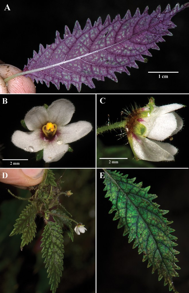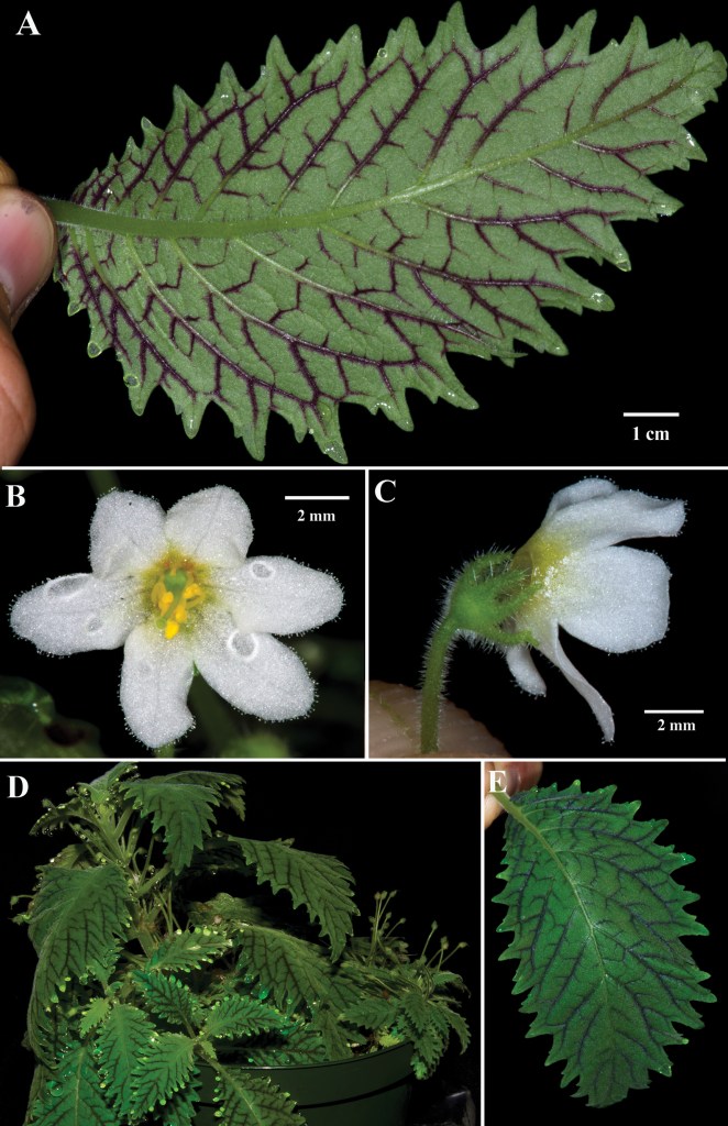Ботаники описали находку, как литофитное травянистое растение с чешуйчатыми корневищами; стебель короткий; листья свисающие горизонтальные, собраны в прикорневой розетке. Листья супротивные, почти равные; черешок от голого до редко опушенного, длиной от двух до пяти миллиметров; пластинка пленчатая, в высыхании хрупкая, от продолговатой до ланцетной формы, длиной полтора-пять сантиметров и шириной один-два сантиметра, с шестью-девятью парами боковых жилок, края глубоко пильчатые.