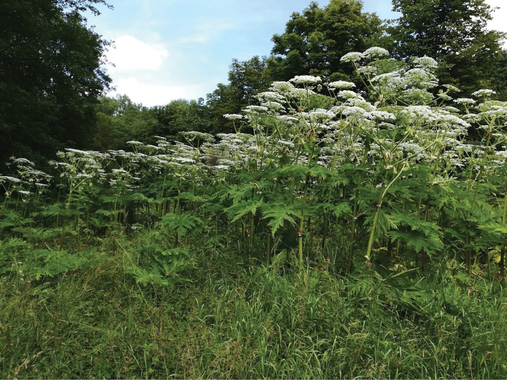 Гигантский борщевик заметно выделяется на фоне другой растительности крупными зонтикообразным соцветиям белого цвета. У него полый и жесткий стебель с пурпурными пятнами. Растение предпочитает влажные места и вырастает по берегам рек до пятиметровой высоты.