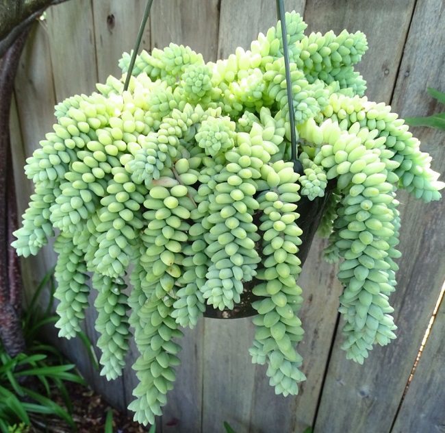 Засухоустойчивый ослиный хвост прекрасно смотрится в подвесном горшке или свисая с полки. Однако пухлые листья этого суккулента хрупкие и склонны к опаданию, поэтому будьте осторожны при пересадке. Очиток прекрасно себя чувствует, когда его не трогают, ему нужен только яркий и прямой свет.