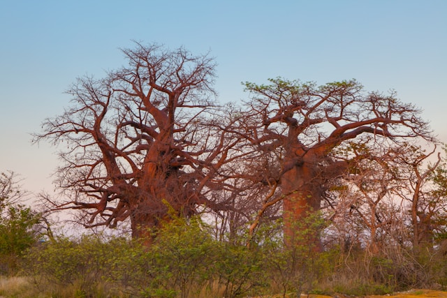Баобабы – уникальные деревья, они входят в число самых долгоживущих в мире, некоторым из них более 2000 лет. Они могут выдерживать длительные засухи благодаря своей способности хранить воду в огромных стволах, достигающих десяти метров в диаметре и более. Ствол обладает удивительной способностью к регенерации, легко отрастая после повреждения человеком или дикими животными, пытающимися утолить жажду.