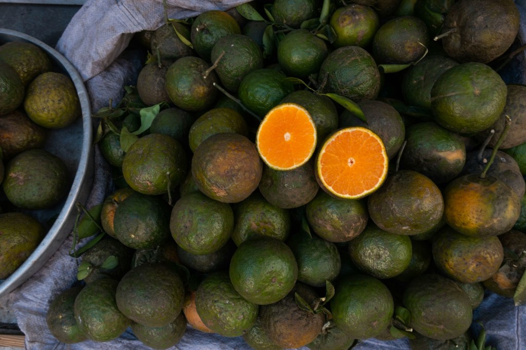 Это правда, в природе апельсинов не существует. Это плод скрещивания мандарина и помело, впервые выведенный в Юго-Восточной Азии, где апельсины традиционно… зеленые. Это связано с тем, что цвет плода зависит от места, где он растет: в более умеренном климате кожица при охлаждении становится оранжевой, но в странах, где всегда жарко, хлорофилл не разрушается и плоды сохраняют свою расцветку.