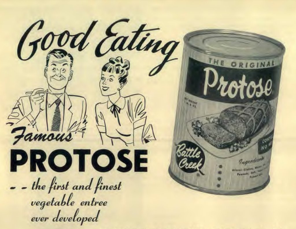 В 1896 году Министерство сельского хозяйства США обратилось к Джону Келлогу с просьбой создать растительный пищевой продукт, который мог бы служить безопасной и питательной альтернативой мясу. Энтузиаст принял вызов и разработал несколько инновационных продуктов. Среди них были Nuttose из измельченных орехов и злаковых зерен, Granose — печенье на основе цельной пшеницы и Protose — смесь пшеничного глютена, злаковых и молотого арахиса. Осознавая их коммерческий потенциал, в 1899 году Келлог основал Sanitas Nut Food Company, которая к 1912 году ежегодно поставляла на рынок США более 65 тонн «растительного мяса». Chicago Tribune смело заявила, что производитель решил «мясную проблему».