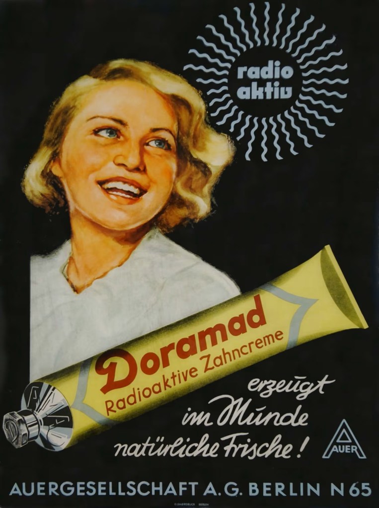 Моя бабушка выросла, чистя зубы радиоактивной зубной пастой, активным ингредиентом которой был облученный карбонат кальция. Отец бабушки, мой прадед, был химиком, отвечающим за производство этой пасты, и еще до того, как продукт появился в магазинах, принес тюбики домой. Под торговой маркой Doramad зубная паста обещала десны, «заряженные новой жизненной энергией», и «ослепительно-белую» улыбку. Квартира семьи находилась так близко к фабрике, что все засыпали, слушая бурление автоклава.
