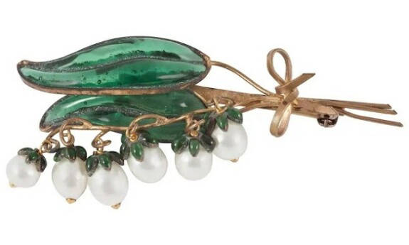 В этом же сезоне ювелирная линия Dior пополнилась брошью с серебристым ландышем, украшенной серым и белым пресноводным жемчугом.