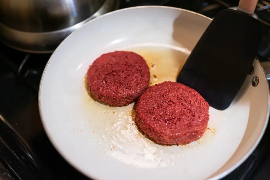 Искусственные бургеры имеют красный цвет и шипят на сковороде