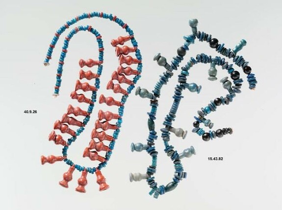 Также в Мет выставлено большое количество бус периода Нового царства, которые изображают бутоны или распустившиеся цветы. Бусины и бисер использовались в одиночных нитях и декоре широких воротников, были особенно распространены после эпохи Хатшепсут, то есть после 1458 года до новой эры. Две самые популярные нити бусин изображают бутоны маков и васильков, которые были привычными в египетском саду и использовались для изготовления свежих букетов, украшавших святилища.